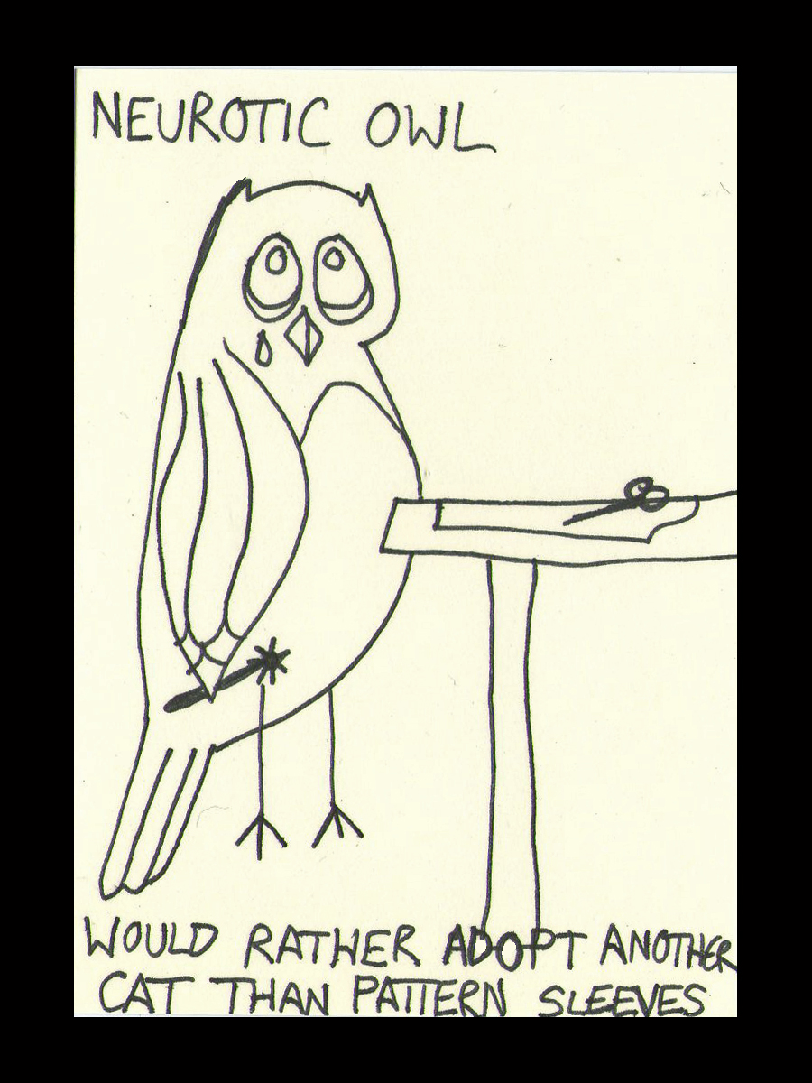 By the way, if there’s something you want to see Neurotic Owl, Manic Pixie Otter, or even Food Truck Hedgehog do, let me know. No promises, but strong likelihoods. For instance, a friend mentioned on Facebook that she was having a frustrating time patterning sleeves, so this happened: