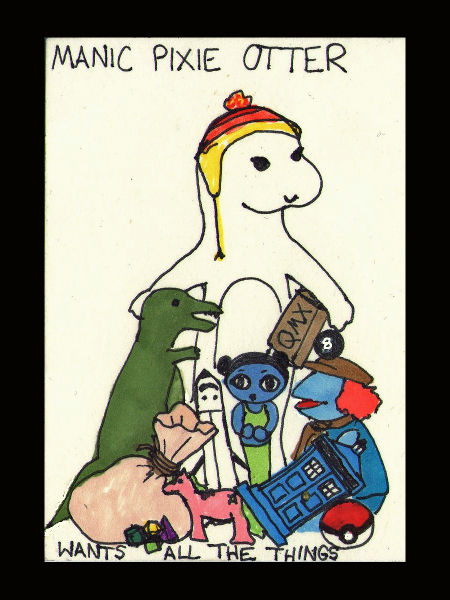 For the record, ‘the things’ include a Jayne hat, a toy dinosaur, a dice bag and many dice, a my little pony (although it looks sort of like a crappy knockoff), a toy shuttle, a fruity oaty girl, the TARDIS, a Pokeball, a Fraggle, a Quantum Mechanix box full of mystery!, and a magic eight ball. Eventually I’m probably going to do a larger version with her floating in a sea of things.