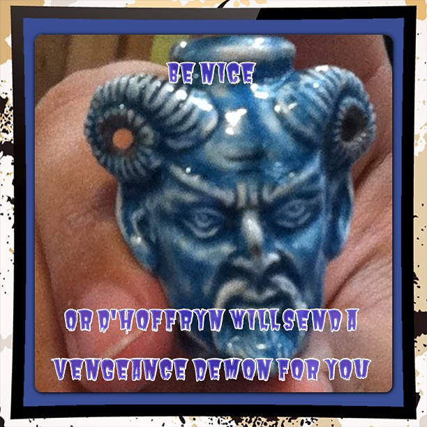 which I promptly gave to a friend who liked it, and was later meme’d by another friend, so don’t give me credit for the meme-ing, please. You can’t see it, but there’s a cork in his head for the storing of perfumes/essential oils/poisons/virgin’s tears. Nameless friends, if you want to be named, tell me in the comments and I shall edit. I don’t want to go posting people’s names without permission, but you know who you are. I assume. Unless tiny D’Hoffryn ate your memories. Also, there was no chapstick; just makeup I hardly ever wear.