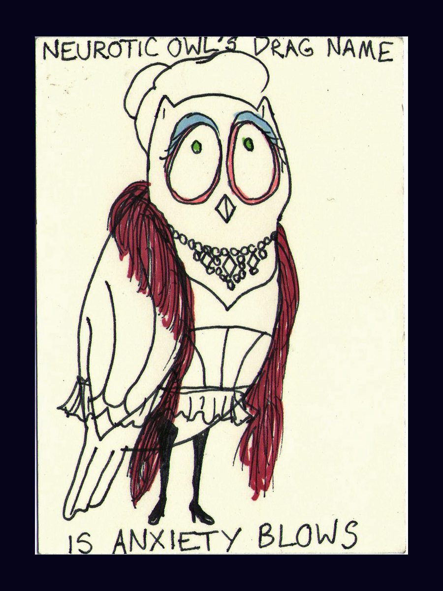 Anxiety Blows would be an awesome drag name, though – I stole it from a friend’s Facebook status a few days ago, before someone else’s joke about a stripper name turned into a long, painful argument about insensitivity and sex work and blah blah blah Facebook. Argue on your own time, bitches – not on Snarky McAwesomepants’ (not their real name, btw) serious complaint about anxiety, which does, indeed, blow.