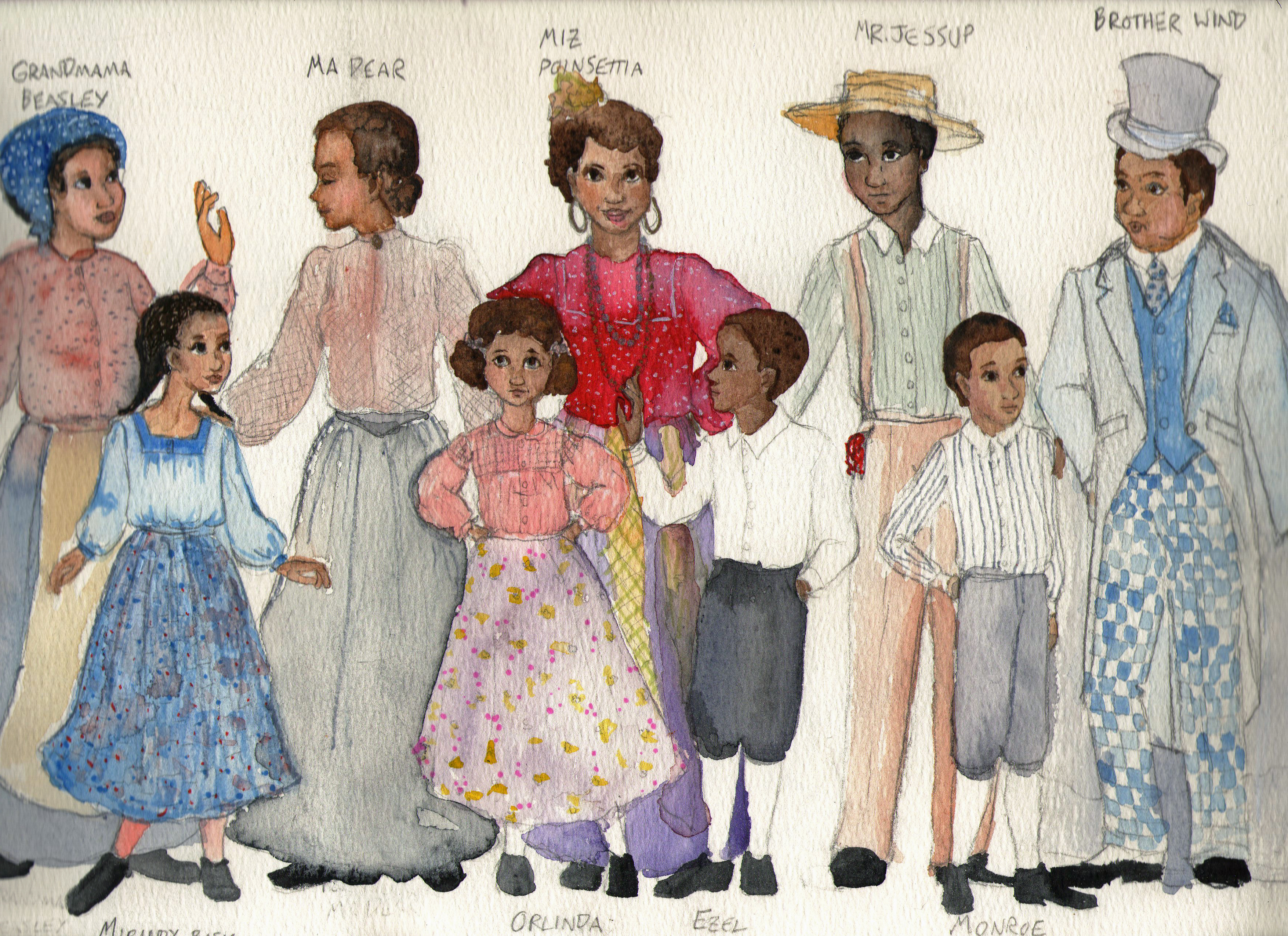 So this is a rendering, aka the most fun part of designing a show 90% of the time.  It’s not actually terribly well thought out as an image, since the leading character is not the one in the middle, but rather the little girl in the blue blouse and skirt, but there you go.  The show is ‘Mirandy and Brother Wind’, based on this rather stunning book: