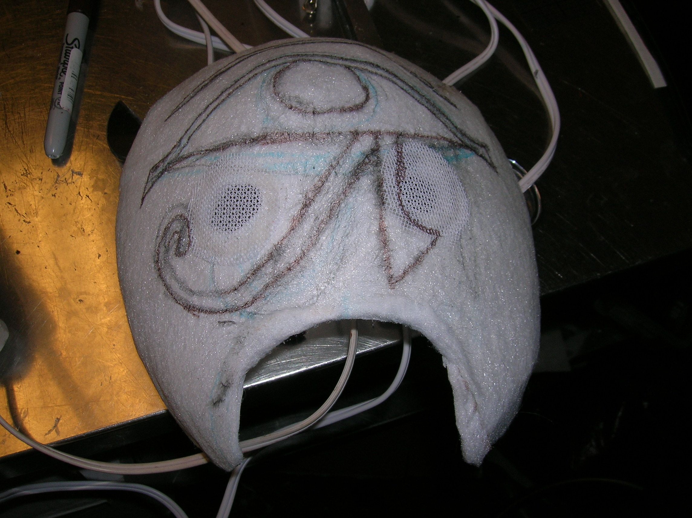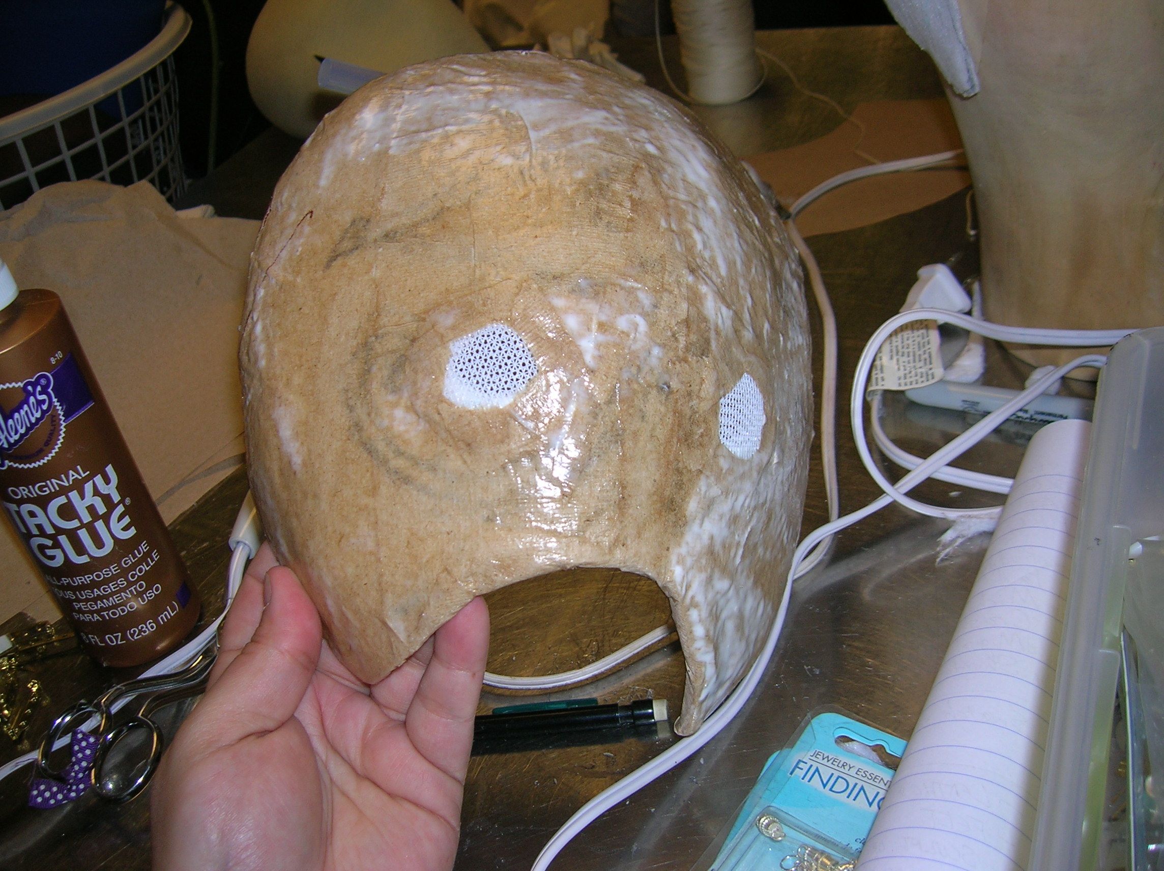 Anyway, since the mask was supposed to look leathery, I covered it with paper towels and glue — the cap too, but I seem not to have taken any early process pics of that.