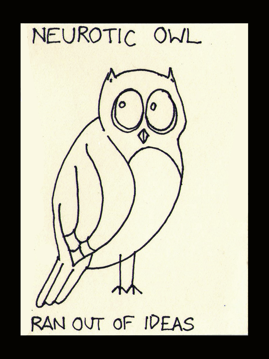 Remember how, weekend before last, I was all, “All work and no play makes Neurotic Owl something something” and said that posting would be a bit sketchier? And then, immediately after that, I posted every damn day except for this past weekend, because I’m still giving myself weekends off? Basically, I was at the theatre with my mom, waiting for the show to start, and I drew this about the fact that I didn’t have anything to draw, and then I drew eight more things. So clearly whenever I have no ideas I just need to SAY that I have no ideas, because my brain loves nothing better than to prove me wrong.