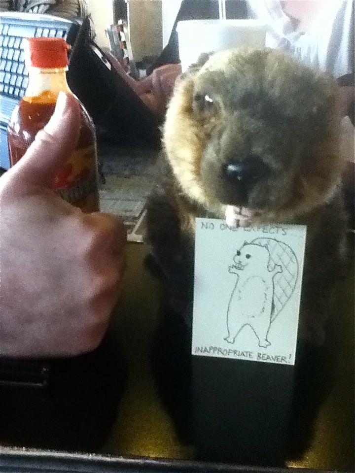 And a thumbs-up of approval from L. In case you can’t read it, because you almost certainly can’t, the cartoon is another iteration of ‘No one expects Inappropriate Beaver!’ because I only steal from the best. Although, if the Spanish Inquisition had been more like a cuddly fluffy beaver and less like a hideous time of torture and persecution that would have been a much better surprise.