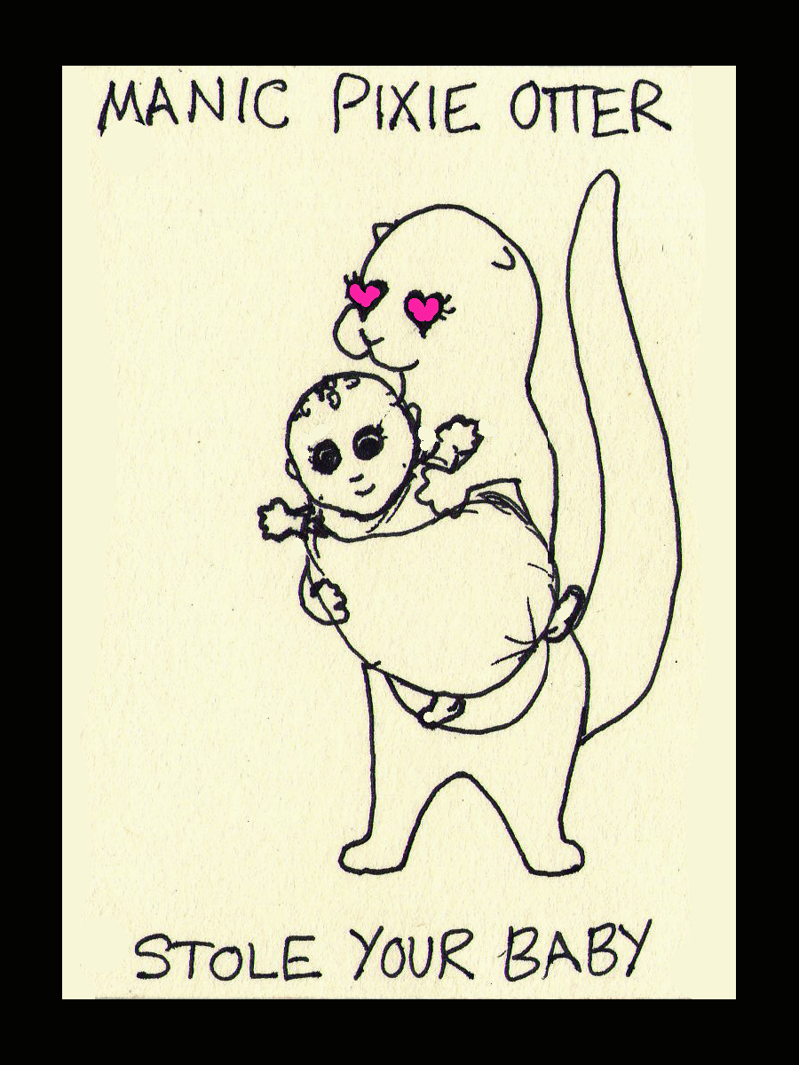 Seriously, I was going for cute. She’s not stealing the baby permanently, she just wants to hold it and sing to it and possibly sniff its head and play with fat baby toes. While they’re attached to fat baby, not separately. Oh, god. Sadly, when I replaced her eyes with hearts (in fine Tex Avery tradition), her face became a mask of horror. In fact, I went back and added the pink, because the solid black hearts were even creepier.