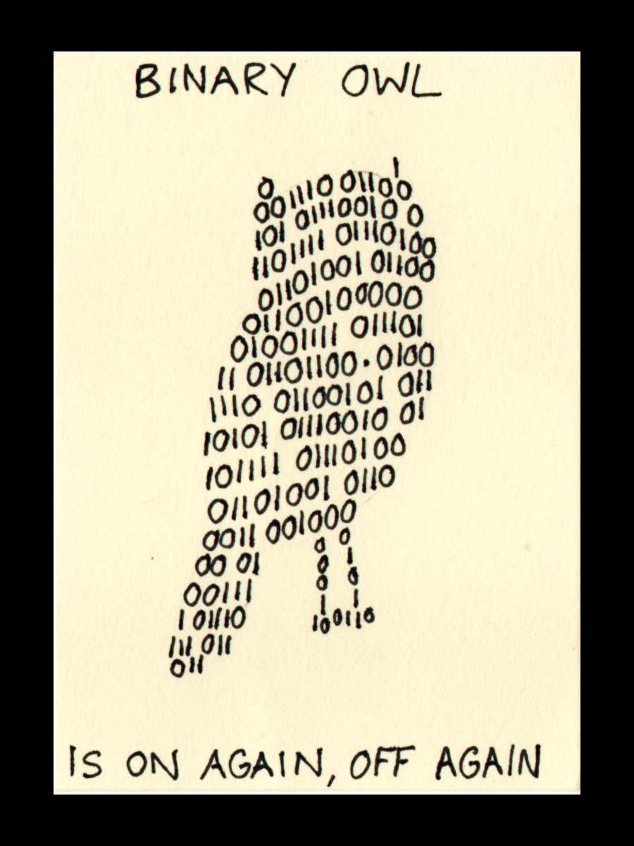 If you could read this (which you can’t, because wrapping it into the owl shape makes it hard to see where the character strings end), you’d be able to translate it and see that it says ‘Neurotic Owl’ twice, plus an Ne because that’s how far I got. The fact that you can’t read it means that using real binary is purely for my own amusement, which makes a weird kind of sense, I suppose.