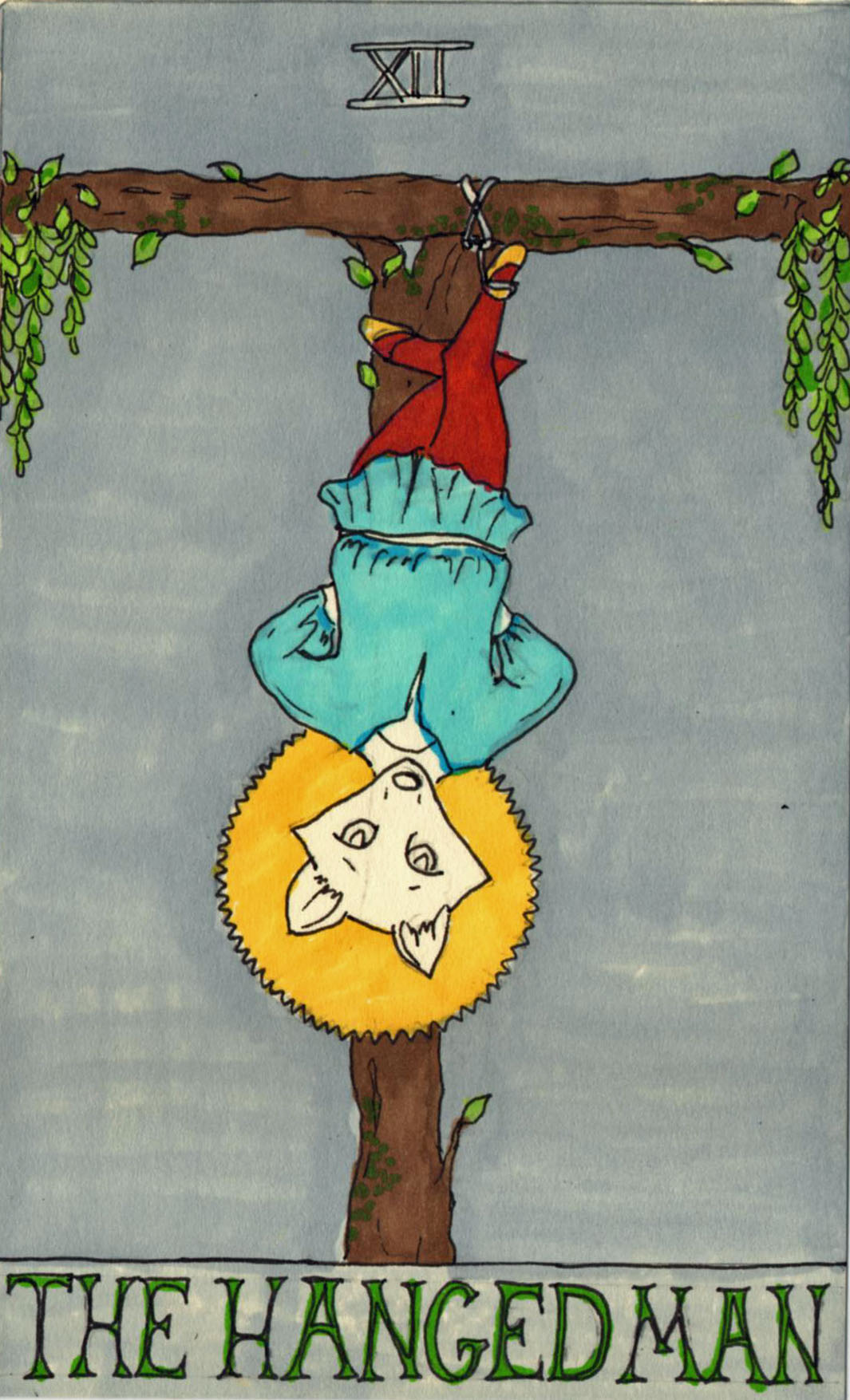 Yay simple cards that happen quickly! Yay blue tunics and red tights and yellow shoes! Hanged man, you are following my Sesame Street mix ‘n match ethos, wherein all colours are good colours. Good for you. Hang in there.