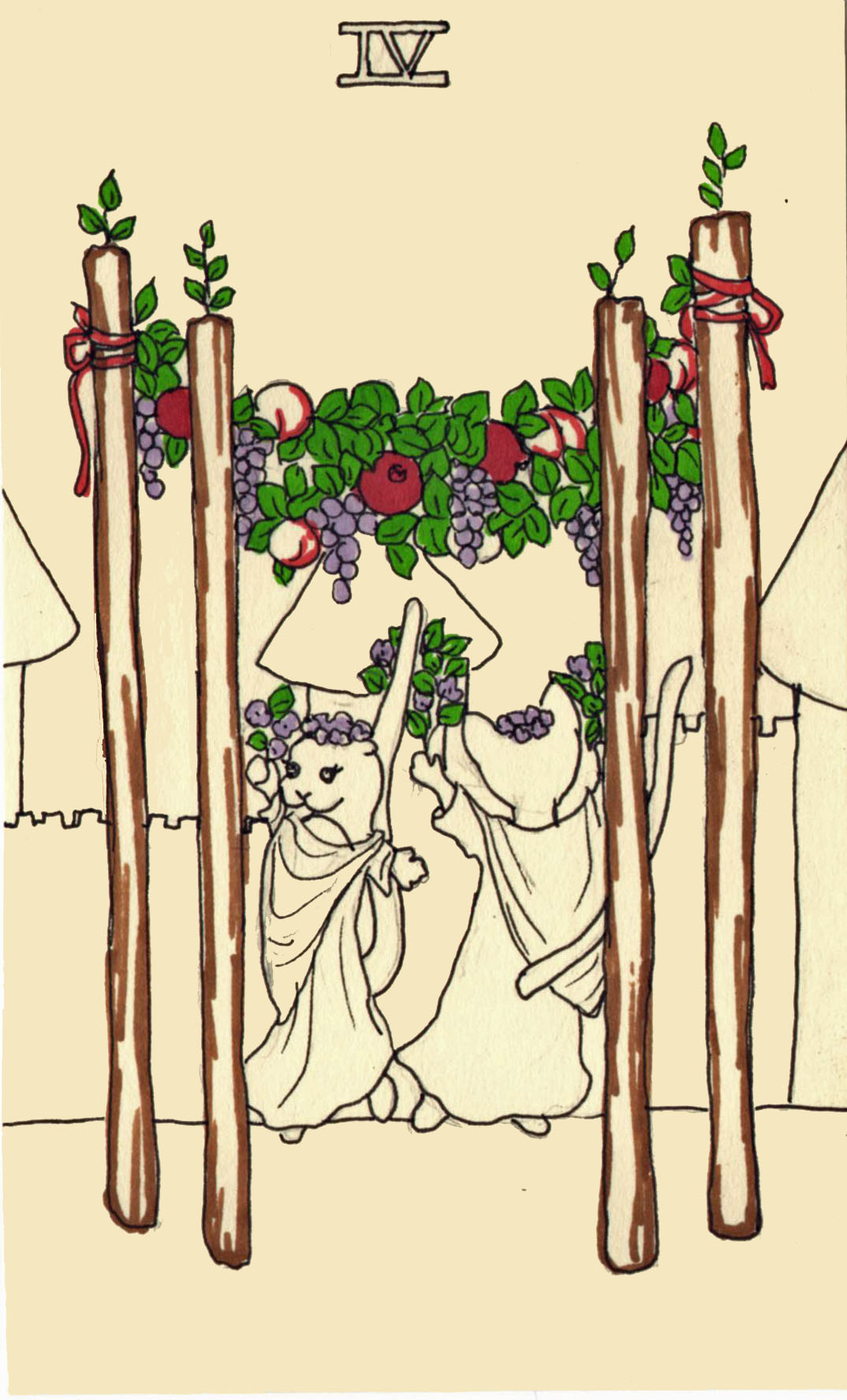 Because I’m sorry, that is clearly a sukkah, with or without walls. Which is fine — lots of cultures have a similar sort of harvest festival, so I’m not feeling like this is to appropriationist. Which I know is weird to worry about since I am, in fact Jewish, but this project is non-religious. Speaking of Jewy things, though, I got on a little creative roll last night, and if I ever finish these twelve thousand cards, I may take a short break from critter cartoons to draw Disney-fied Jewish heroines. Miriam and the well! Vashti refusing to dance naked! Lilith being all Lilith-y! Judith dressed like a period hooker and holding up Holofernes’ bloody head! You know, like Disney would do. I’m not drawing Sarah, though, because she was frankly pretty awful.