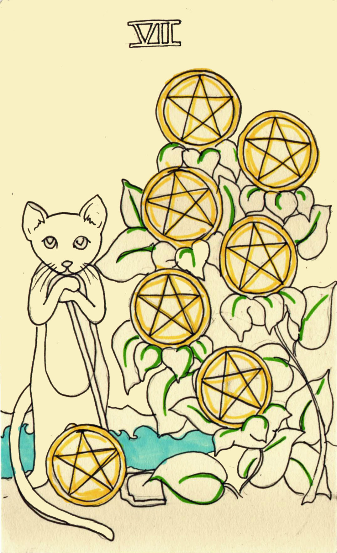 Also, pentacles are a pain in the ass to draw, and I am tired of them. I was all excited when I got to the face cards because they only have one pentacle each, and then I remembered that face cards have text and I suck at spacing, so that was exciting.