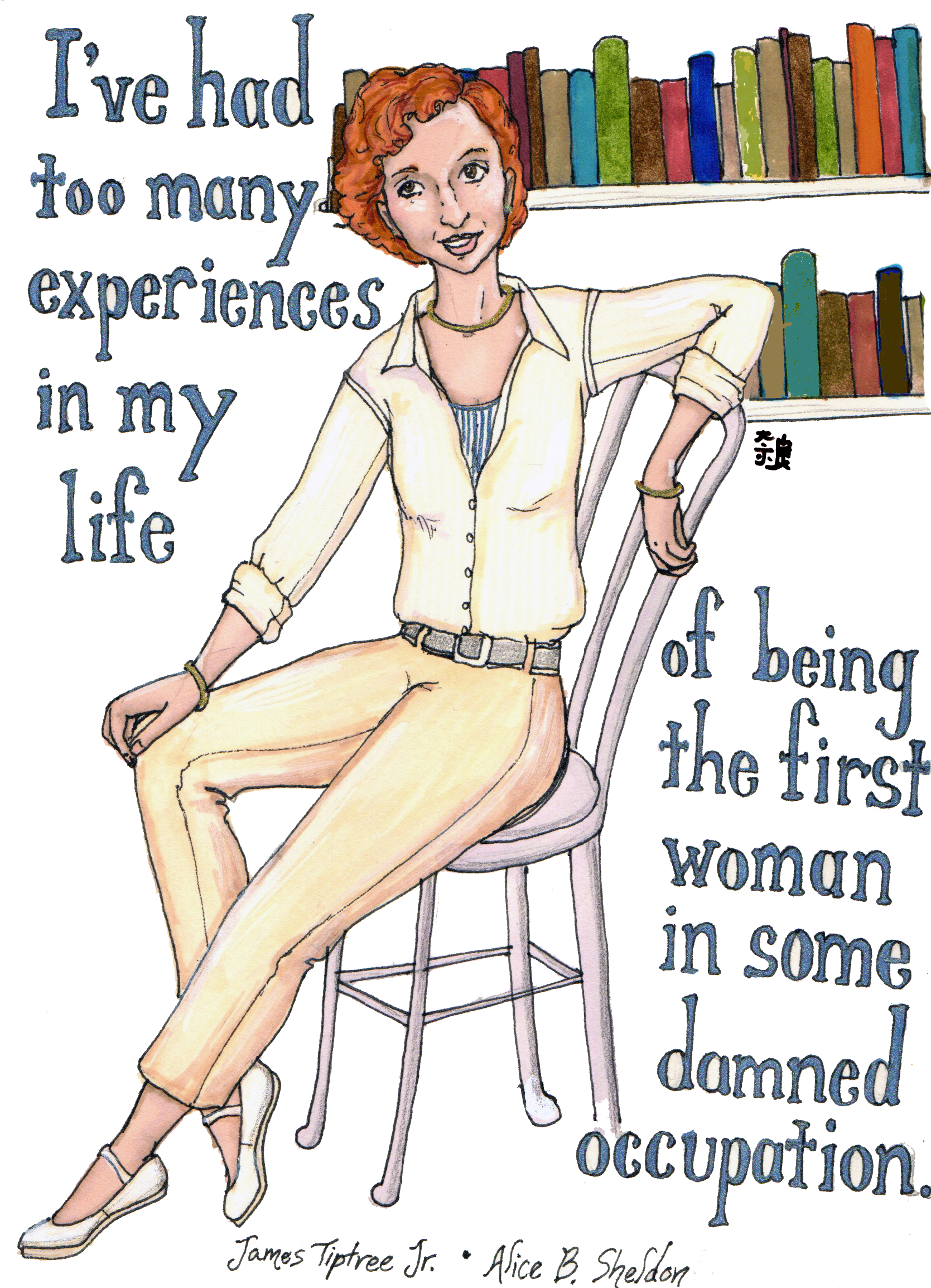 A friend suggested James Tiptree Jr. (or, really, Alice B. Sheldon), and I’m so glad, because now I have SO MANY new things to read. Sheldon wrote as Tiptree starting in the 1960s and managed to keep her actual gender a secret until ten years before her death, to the point that multiple writers, male and female, addressed the rumours that the secretive ‘Tip’ might be female only to deny them. A woman could never write like THAT. You know what? Read this article, it’s better than I can do.