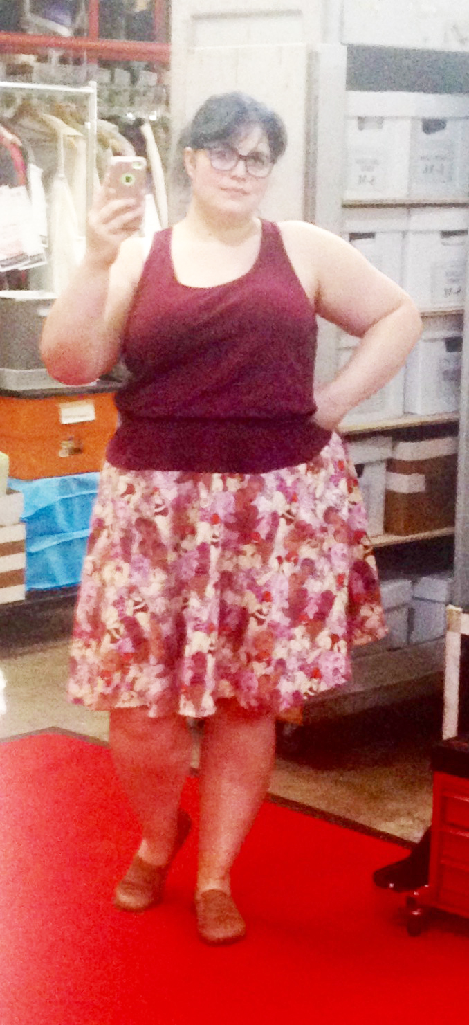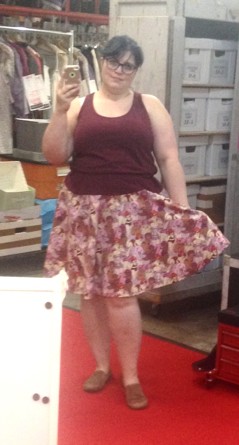 SO LAZY, I am. So look, I figured from the start that that was too much print to be the whole dress, plus $$$$, so I planned to buy a coordinating knit and make a simple unstructured summery top with a pleated drop waist skirt. THEN I realized that buying knit to make essentially a tank top is one option, and the other option is just to buy a damn tank top. So I did that. Also, I decided that pleating that print wouldn’t show it off well enough, so 3/4 circle skirt! And finally, after the skirt was on, the bust darts were in, and the whole thing was hemmed, I realized that I always think I’ll like unstructured and actually on me it looks turrible, so time for an elastic casing. Basically it looks a lot like I’m wearing a top and skirt, but the skirt doesn’t sag down in front and I don’t have to worry about finding two matching items of clean clothing, and also it’s breezy as shit.