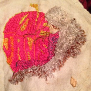You guys, I did this thing AGES ago (2000? Maybe?) while I was interning at the Bay Street Theatre and, not coincidentally, working on Love Janis. I was staying in dorm housing and didn’t have a car or many supplies with me, so this is based on a few rogue supplies that turned up in my bags (much of it regular sewing thread) and a tiny scrap of muslin the shop was tossing. The question is, what shall I do to finish it? I’m kind of thinking a crazy quilt inspired applique around it till it’s big enough to frame; I’ll have to see how many fabulous scraps I have around. I was originally planning to do way more coat and a bottle of Wild Turkey in her hand, which is why there’s a rogue patch of skin, but I say no to that much turkey stitch. Thoughts?