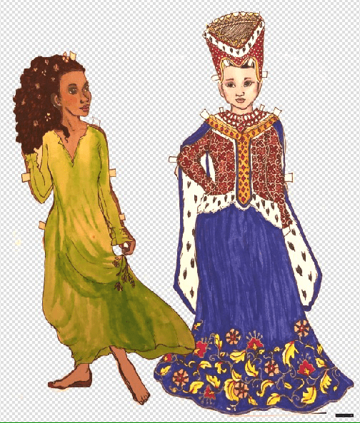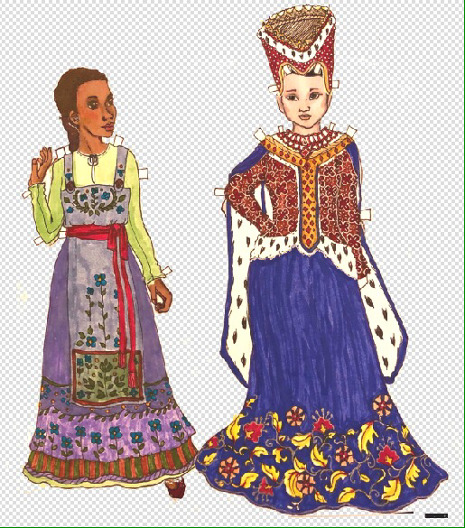 I used Margaret of Denmark as a model for Gertrude and Viking research for Ophelia, with Danish traditional dress motifs added to both. Sane Ophelia has a cute little pointy coif on her head; I couldn’t get that to line up AT ALL from my shitty photos, and I can’t open the real scans on my iPad, so expect life to be frustrating till Asus sends my computer back. I kind of sort of managed to squish and stretch things till they almost lined up, us your imaginations.