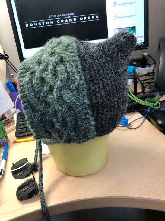 That is apparently not how a beginner learns to cable. Whatever, nothing exploded, everything’s great, I have a hat that makes me look like a cross between a pilgrim and an elf.