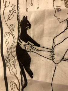 So, now that I’m not destroying my hands with constant hat work, back to my normal bullshit. The stitchalong has me jonesing for embroidery again, so I’m picking this back up after a very long period of neglect. I can’t recall whether I showed it to y’all back when or not? I mean, you’ve seen the base artwork, it’s from my second coloring book, but I’m not sure you’ve seen the start of this version. I printed it on inkjet fabric and I’m now gradually embroidering over the drawing. After I’ve done everything that involves satin stitch or outlines I’ll be laying Aida behind it so that I can more easily do black work (but in white on white) in all of the big blank areas, and luckily that stitchalong is getting me more comfortable with the idea of doing blackwork without worrying about the back and designing my own fills.