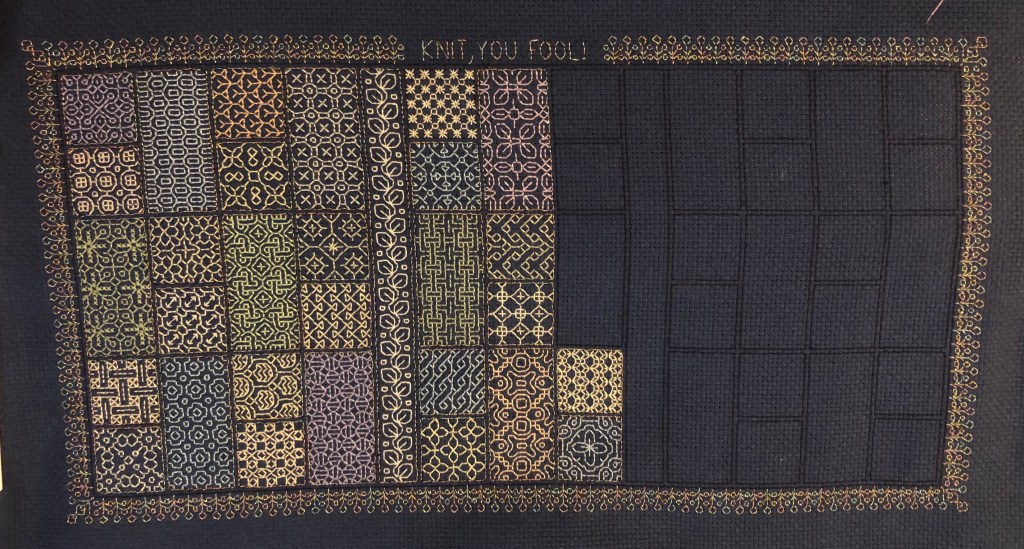 So I don’t think I’ve shown you the blackwork project that’s going on the front of that knitting bag in a while. This is from the Peppermint Purple stitch along (you can find it on Facebook and her other patterns on Etsy), so it won’t be finished till the end of the year, since she releases one new block a week.