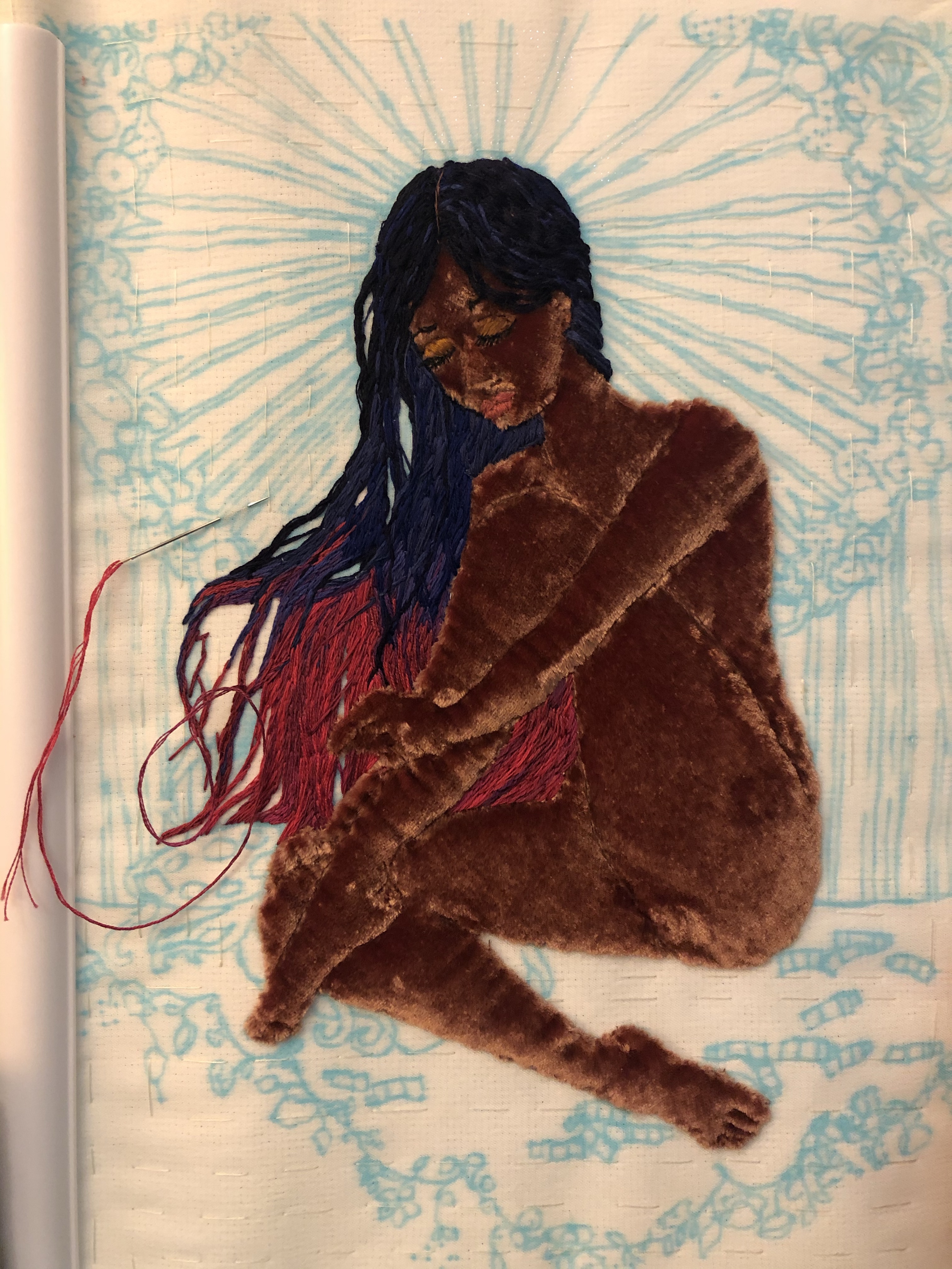 I’m using a silk velvet for her body, so embroidering on top of it is a little bit of a learning process and I definitely have more work to go back and do on her eyelids and lips. But the massive swathes of hair are coming along!
