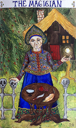 Card number 2, yay! I settled on Baba Yaga for the magician for lots of reasons. The magic, sure; also, she’s this really layered two sided character who in some stories is evil and murderous and eats children, and in others helpful and mischievous and wise. For her symbols of the four elements, I have a bowl of water for. . . well, water, duh; a pomegranate for earth; a knife for air; and a firebird feather for, you guessed it, fire. I also worked in a snake piting its own tail as part of the embroidery on her jacket, and there are fruits and flowers all over her embroidery and the trees behind her. I was really pushed there – I originally wanted hanging flowers and vines behind her, but everything else was so rooted in the taiga that moving the trees elsewhere seemed like mixing my themes. Sooooo I may have painted holly berries onto what really doesn’t look like a holly tree, but at least they’re both evergreens and fuck it, she’s magic, she does what she wants.