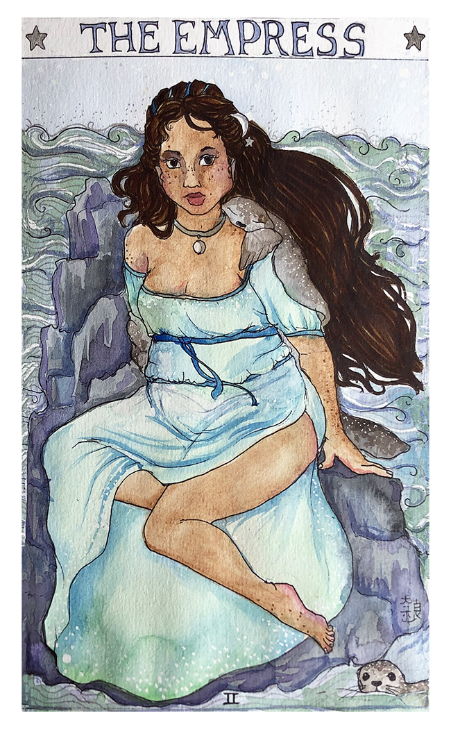But ok. My Selkie has her skin safely over her shoulder, and she’s out in the sea, not staring longingly through a window at it. She’s both part of nature and apart from it, she’s fertility and transformation, she’s mysterious but open. She’s the mistress of her own powers. If she takes a human husband, it’ll be on her terms. Also she’s fat, why the fuck did I ever draw a seal woman skinny? (I’ll take internalized fatphobia and self-loathing for $5000.)