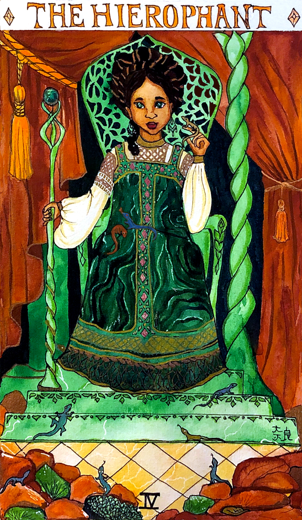 Ok, next thing. I WAFFLED on this one, and then ended up going with my first impulse which I should really always trust more. The Hierophant is a weird card for me as a Jew, given that the version I’m most familiar with is hella pope-y. But also even when interpreted as more of a teacher/mentor, there just weren’t a lot of great options leaping to mind. I did consider Cinderella’s mother’s ghost’s tree (and if that means nothing to you, basically there was no fairy gomother originally – Cinderella goes and prays at the tree that has grown from her mother’s grave and all the fun ballgown and shoe action comes from her mom’s ghost) but that’s a purely benign and giving presence, and also very sort of abundant and fruitful and none of that feels right for a fairly forbidding card. So, back to my first plan – the Mistress of the Copper Mountain/The Malachite Maid/just a whole bunch of other names, really.