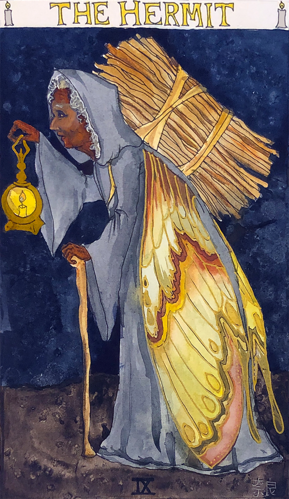I had one false start before I realized the character would work better on a different card (vague vague super vague), but the only issue when I picked this character/trope/repeating theme is that she almost never gets a name. Mother Holle in Grimm’s fairytales is one version, but a version that reads less hermit-y to me, so she’ll likely turn up elsewhere – maybe in the lesser arcana. But in tons of different stories, the hero or heroine runs into a fairy in disguise.