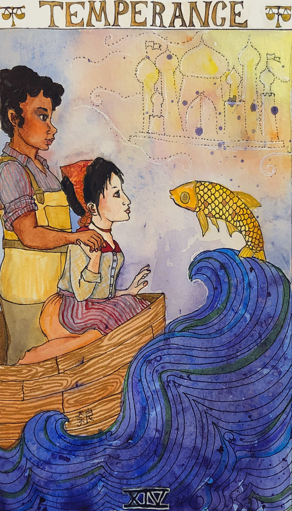 ANYWAY. So this morning I took a walk through the list of major arcana just to see what might fit what, and Temperance leapt out at me as an even better fit for the existing card than the Wheel, which meant all I had to do was paint out the lettering and redo it, and sneak in a few more numbers. So NOW the Wheel is up next again, but now I also know exactly what I’m doing for it.