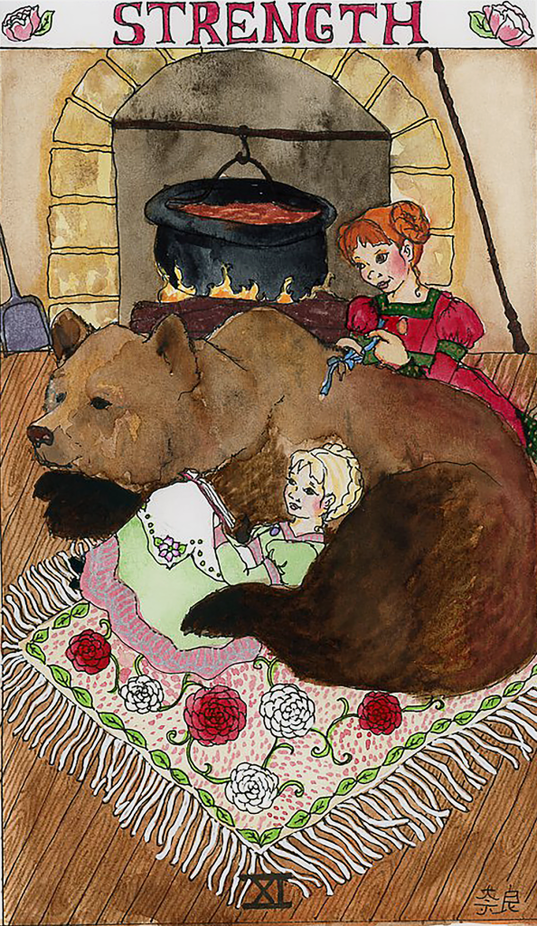 Anyway, the RWS strength card is a woman holding a lion’s mouth closed, and I’m a fan of a slightly different version, where it’s about lack of fear and friendship and a little girl feeling totally safe braiding ribbons into a bear’s fur.