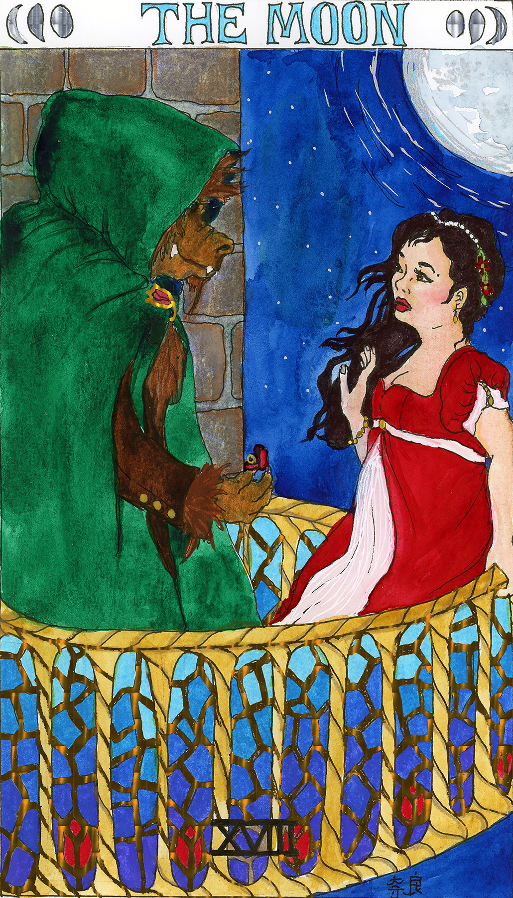 Anyhow, this is a card about illusion, fear, and intuition, all of which made me think of Beauty, afraid but seeing the sweet cuddly himbo under the scary exterior.