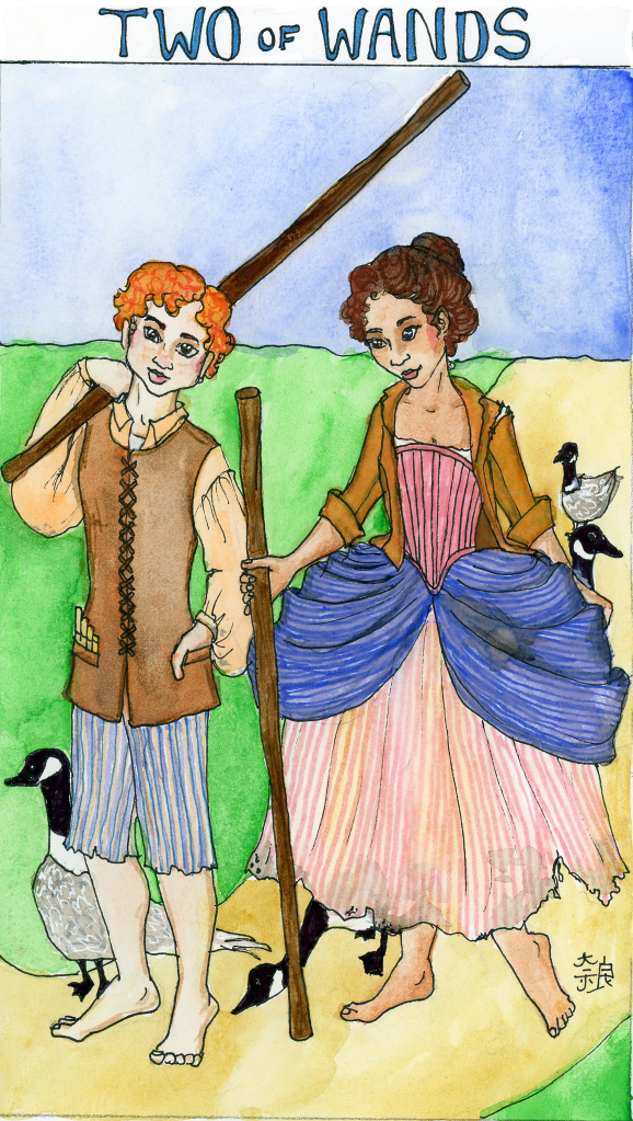 Basically her mother dies when she’s a baby, and her grandfather is so destroyed by the loss that he refuses to look at her or care for her and she grows up dressed in tatters and running wild with her pal the gooseherd. (I decided to make the gooseherd a trans man but honestly short of much more realistic drawings or, like, scars, it’s fairly hard to indicate that in a drawing, especially if you’re me and any man you draw looks pretty femme.) Anyhow, she and the gooseherd meet the prince on the road, he falls in love with her instantly, she tells him to wait till the royal party that night to ask her again. Then they trot off to the party just as they are but surprise! As soon as they (and the fucking geese, I love it) are in the ballroom the gooseherd plays a tune on his pipes and Tattercoats is magically dressed as a princess! And the geese turn into pages! (I prefer to believe that they kept goose personalities so there were just a bunch of fancily dressed lil pageboys running around screaming at and biting the guests.) And then love, marriage, happiness, NO FUCKING EXPLANATION OF HOW THE GOOSEHERD WAS SUDDENLY MAGIC. It’s great.