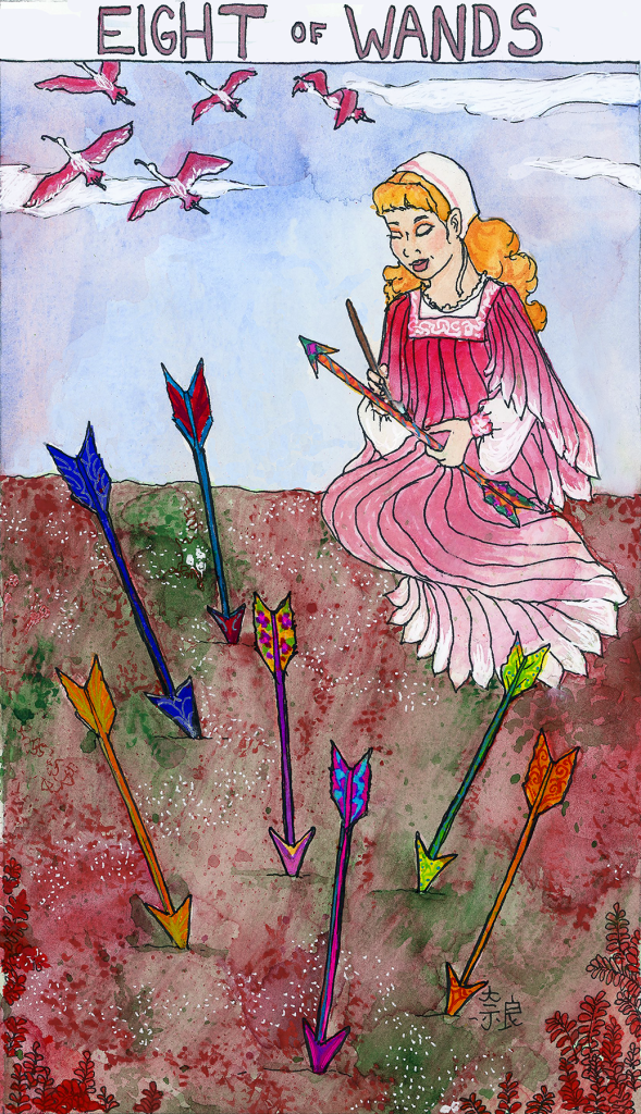 This version is way more fun, though, because the choice lies with the women. A woman tells her three sons to put arrows into the ground overnight. In the morning, their arrows are all beautifully painted. The next night they do it again and hide to see what’s happening, and a set of spoonbills lands, transforms into beautiful maidens (I’m going with generic girl descriptor here, not making assumptions regarding their virginity), and each girl picks the arrow of the man she wants to marry and decorates it all purty.