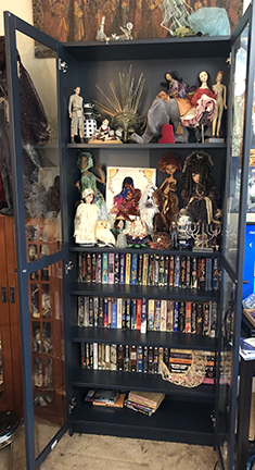 Got that glass-doored bookcase delivered and built and filled and YAYYYYYY my stuff is in a place away from both dust and cat. It looks pretty, too. I may actually end up swapping the books into the small case next to it and the curios from there into this one, since it’s much easier to see through the doors and my books are beat up much read paperbacks, not fancy display objects.