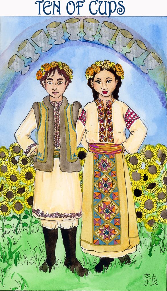 Anyway I was already planning to use the happy couple for the ten of cups, and they were probably going to be in Romanian folkwear (because I love traditional dress) and then, y’know, some shit started going down and I just really wanted to draw a joyous triumphant happy ending card for Ukraine right now. It’s a pretty empty gesture but aside from donating money and paying attention (both done/in progress) there’s not much else I can do, is there?
