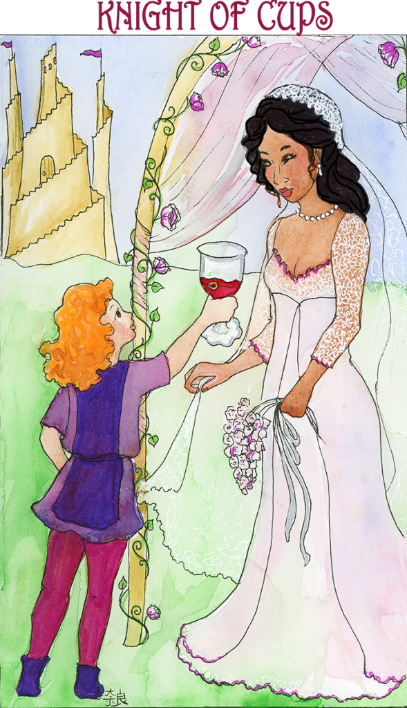 Between work and being overwhelmed with all the life stuff work forced me to put off it’s been hard to have energy for creative stuff. I actually had this painted and ready about a week and a half ago and it still took me till today to actually scan it and get it cleaned up. I’m pretty excited about the next card, though, so hopefully I’ll be getting back to a more regular schedule. The queen of cups is going back to the Goblin Market, and I looooove hanging out there.