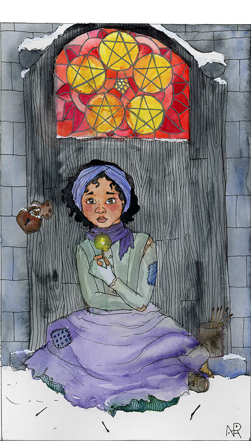 I feel like everyone knows this story? Poor little match girl huddled in the cold, begging passers-by to buy her matches and having no luck. One by one she lights a match to stay warm and sees visions of a cozy home, a lovely dinner, etc. in the flame till they burn out. She sees a vision of her dead grandmother and lights the entire remaining bundle at once to keep the vision going longer, and in the morning she’s found frozen to death with a smile on her face because now she’s happy in Heaven.