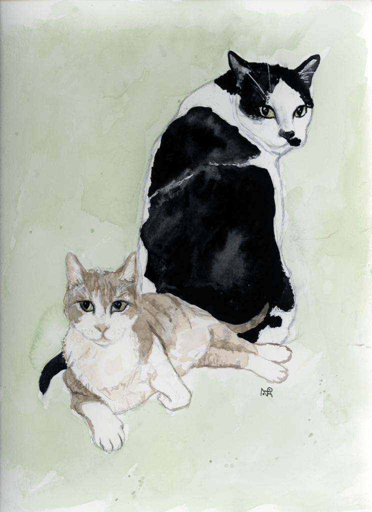 So I spent a couple of days thinking about what to do for a wedding gift, which was challenging because the couple in question are super clean and minimal in their living space (extremely not my aesthetic) and adults who’d been together for years and don’t need the traditional household setup stuff. It took longer than it should have to occur to me that I could give them a cat painting, but I got there in the end.