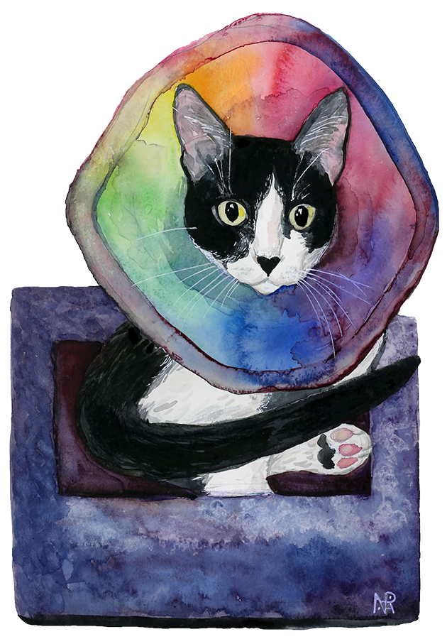 I swear I love both of my new cat siblings very very much and there will definitely be a painting of Greedy sometime soon too, but LOOK at this offended baby in her cone.