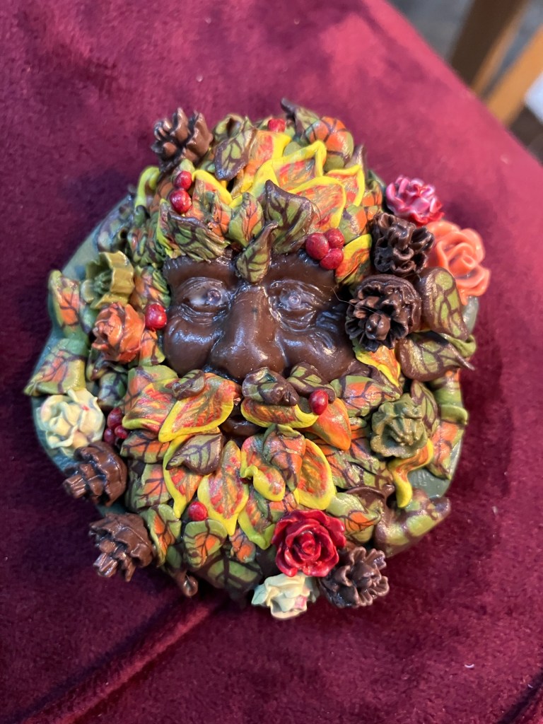 All of the leaves on the Green Man are canes I made with the help of a YouTube tutorial and I think they’re pretty decent for working with very soft off-brand clay and without a pasta sheeter.