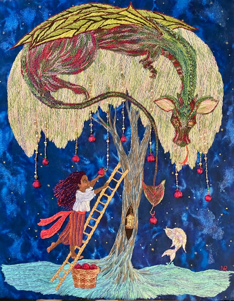 So obviously I added the beaded chains to the pomegranates, but also once I looked again at the dragon all at once I decided it was a little disjointed and the green neck was feeling disconnected from the rest of the body. So I went back in, adjusted the upper spine stitching to fall more evenly between the wings, added some weirdlittle shell bead spikes, and then carried the green spine stitching down through the back and tail.