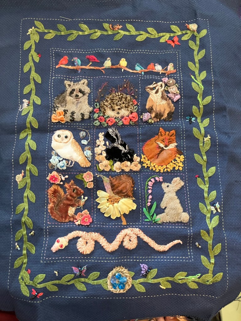 You could not be blamed for having forgotten this project existed – I got frustrated with trying to make the snake square work and put it down for quite a while. But I’m still in an embroidering mood, so after I finished the big piece I picked it back up and I’ve been having a ball adding little critters.