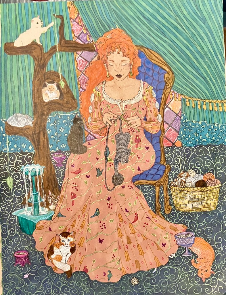 As I mentioned a few days ago, I’m revisiting the idea behind my knitten drawing for ‘Daydreams and Whimsies’ in an expanded version that’s also going to serve as a study for my next embroidery project.