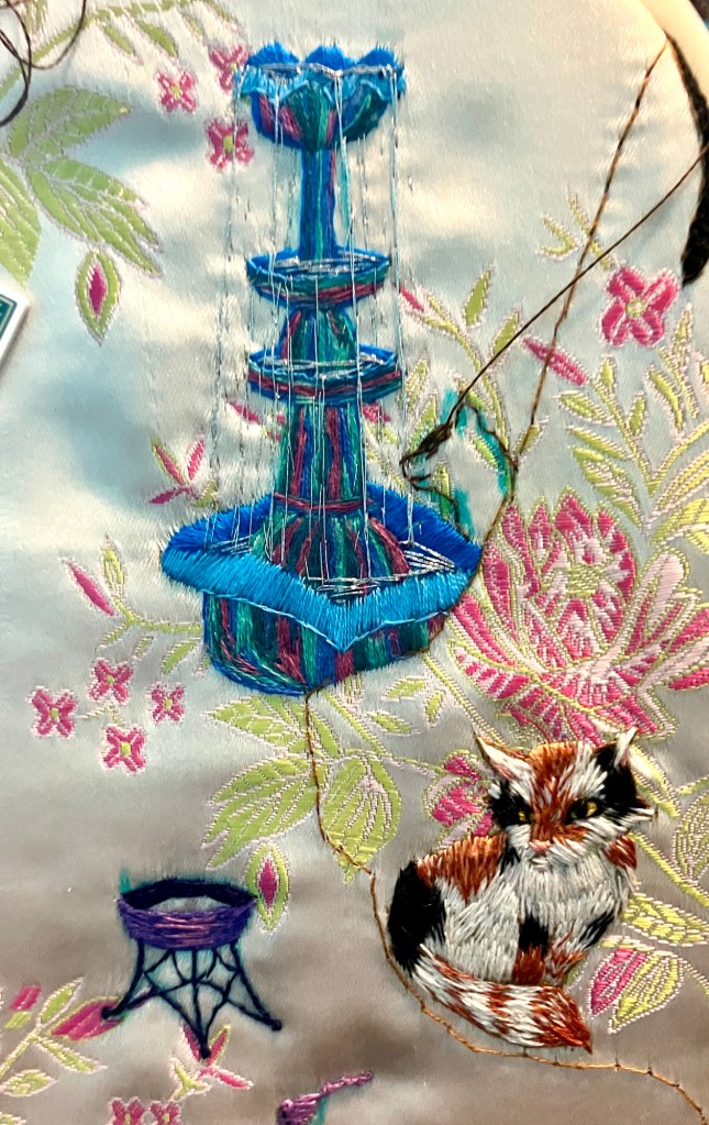 If you thought the food dish was fancy, LOOK at this ridiculous fountain. In my head it’s glazed pottery but really I’m just happy the silver thread for water worked out so well.