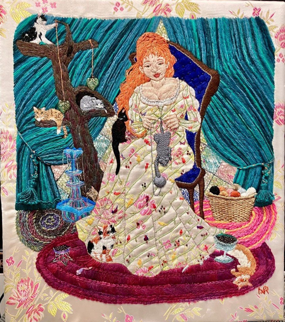 I thought y’all might like a reminder of the ways things change between a drawing and an embroidery – LOTS of the little details and even some larger proportion stuff in this one.