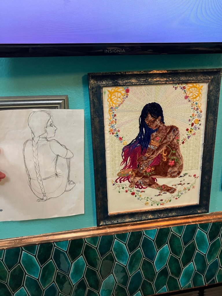 Anyhow, new project begun – I have a specific show I’m hoping to enter this one in and the submission date isn’t till January, so I should make it. Instead of my usual info-dumping about the plan I’m just going 5o show y’all the very rough main figure sketch next to the piece this will be a companion to, and where I am on it at the moment. The poor lady will have a full head of hair pretty soon, I swear.