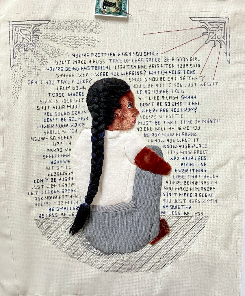 I didn’t forget to post this weekend, I just wanted to get the corner done on the first side so you could see what I’m doing! As you can see the pink threads on the right corner are purely temporary – they’re just there to set the boundaries of each blackwork (ok, greywork) section for me.
