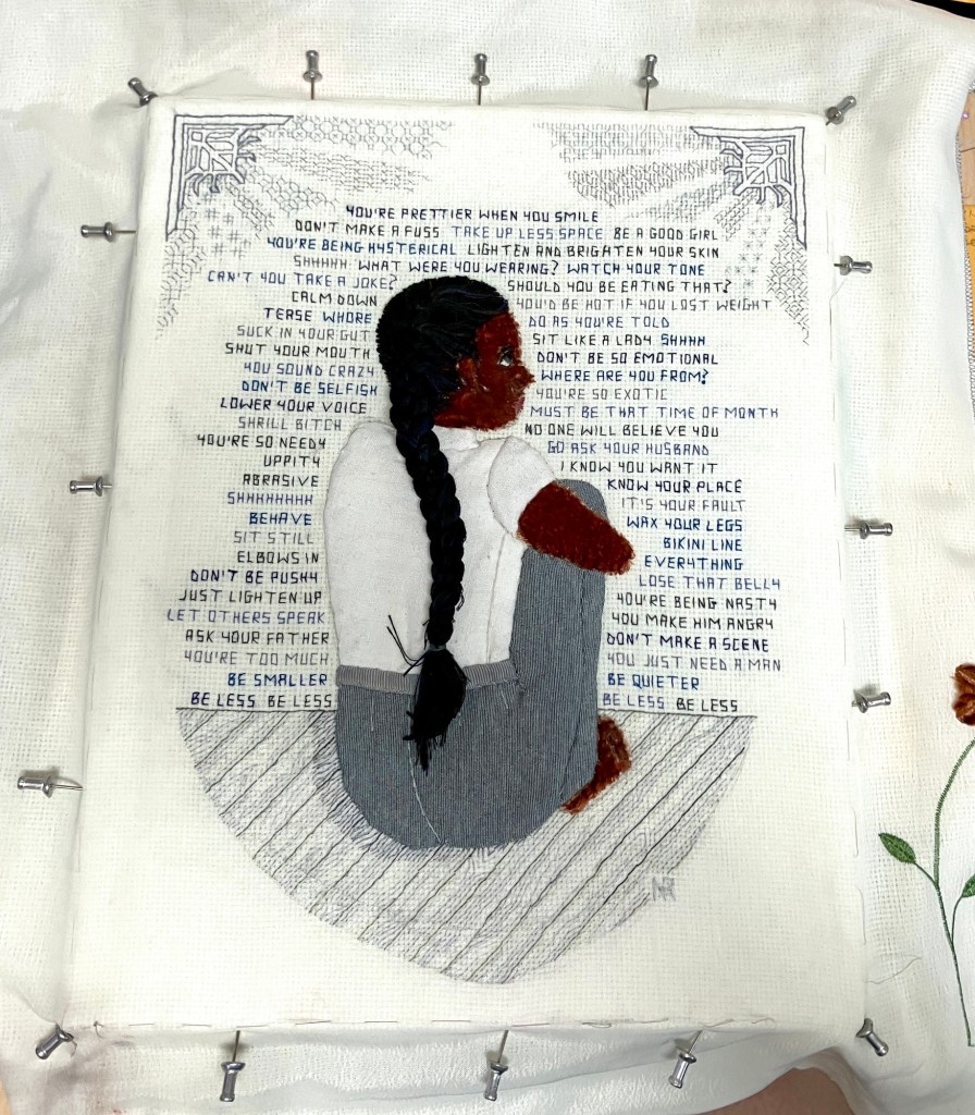 Last thing will be to paint the edges with a dark metallic silver acrylic, but before that I need to decide whether I’m pulling out stitches to erase that unfortunate bump at the bottom of the floor, or adding stitches to even out the rest of the curve.