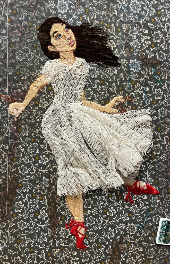 Also I dug out my silk floss for the titular red shoes, and I am very pleased with how much the extra sheen helps them pop. Next up, a bitchload of birch trees.
